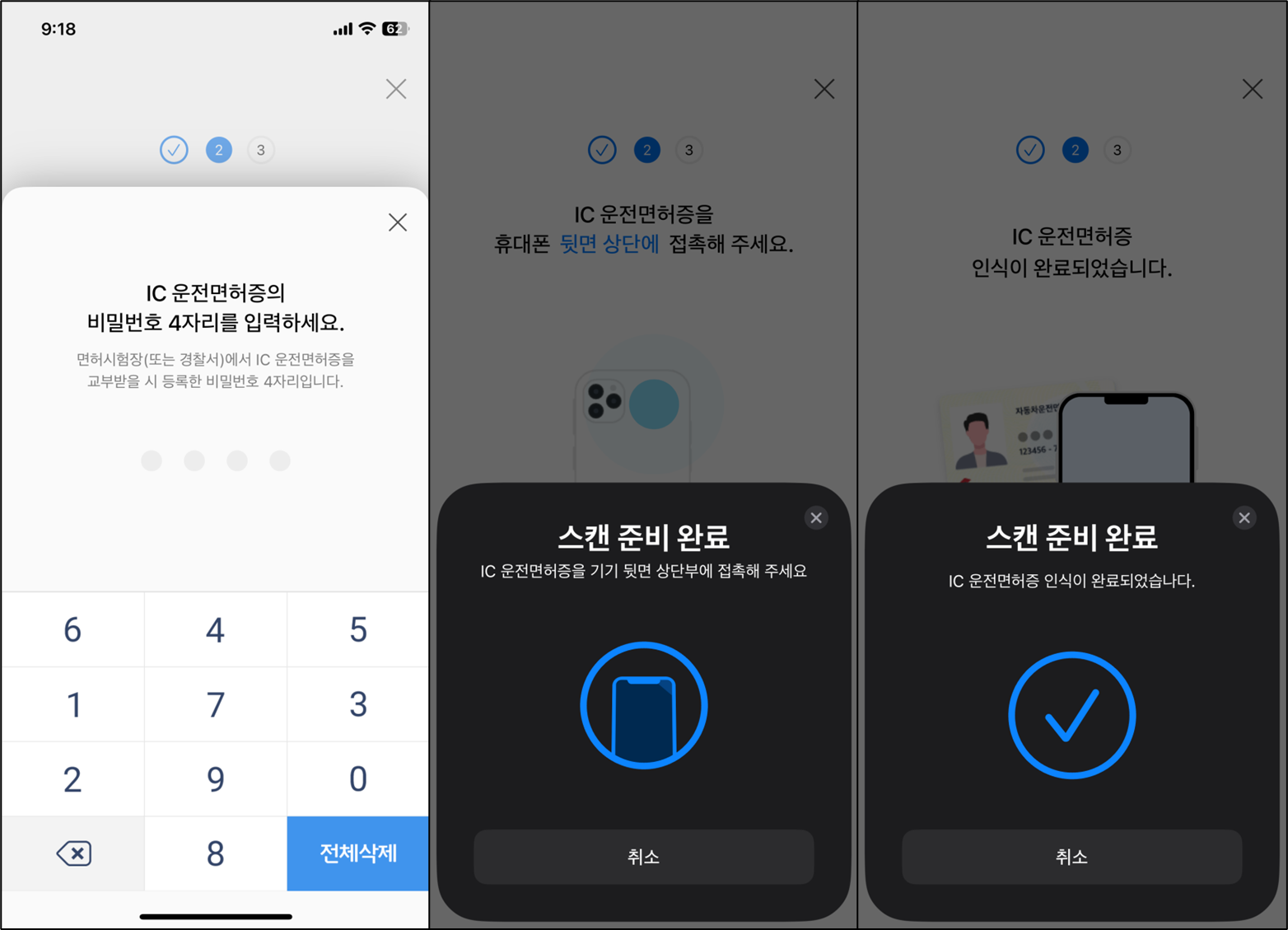 5~6. 휴대폰을 IC 운전면허증에 접촉시키고 있으면, 스캔이 완료되었다는 메세지 창을 확인할 수 있습니다.