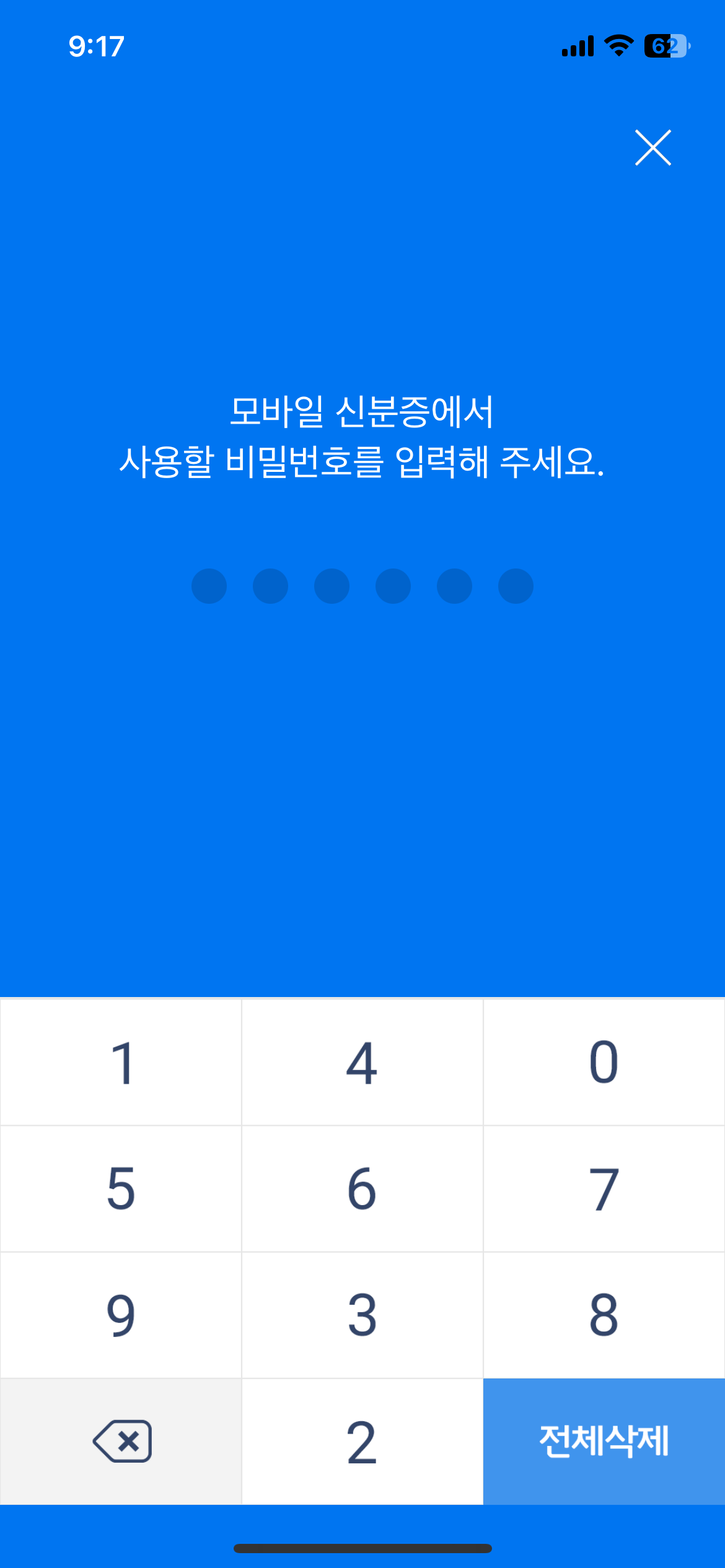 그 다음에는 다시 한번 아까 설정했던 모바일 신분증 비밀번호 6자리를 입력합니다.